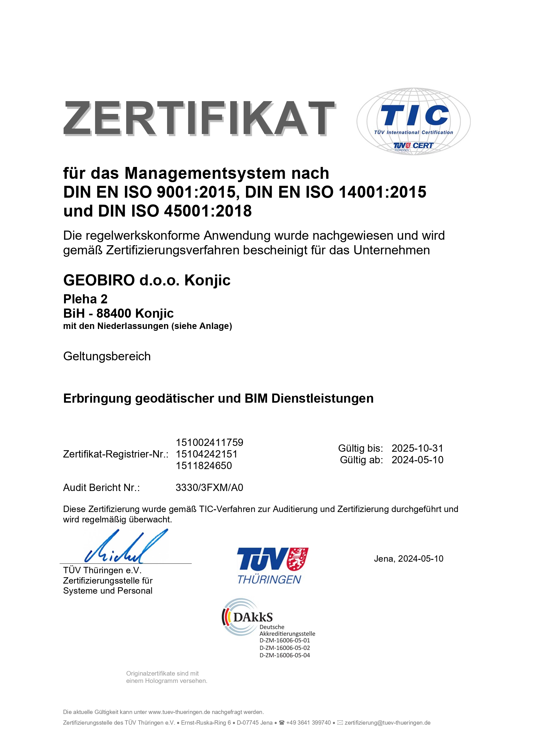 Neben den Bedingungen, die wir zur Zertifizierung für geodätische Arbeiten erfüllt haben, verfügen wir über geeignete technische Mittel und Geräte, um geodätische Arbeiten durchzuführen. Die Zertifizierung ist von unabhängigen geodätischen Geschäftsleuten durchgeführt worden. Das Zertifikat ist von der Federal-Geodätischen Verwaltung ausgestellt.